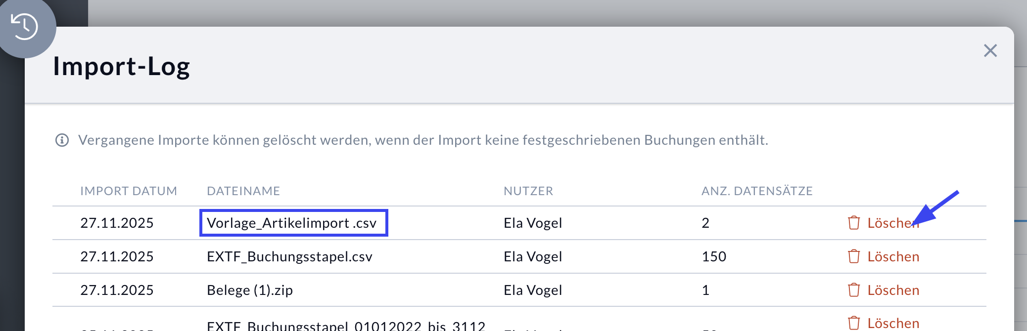 Sollte ein Import fehlerhaft gewesen sein (beispielsweise durch falsche Zuordnungen), lässt sich dieser komplett rückgängig machen:
