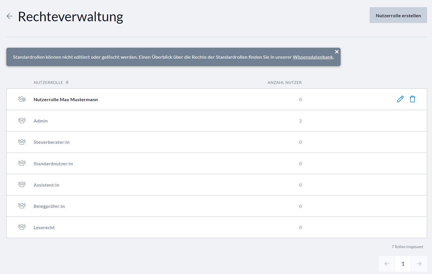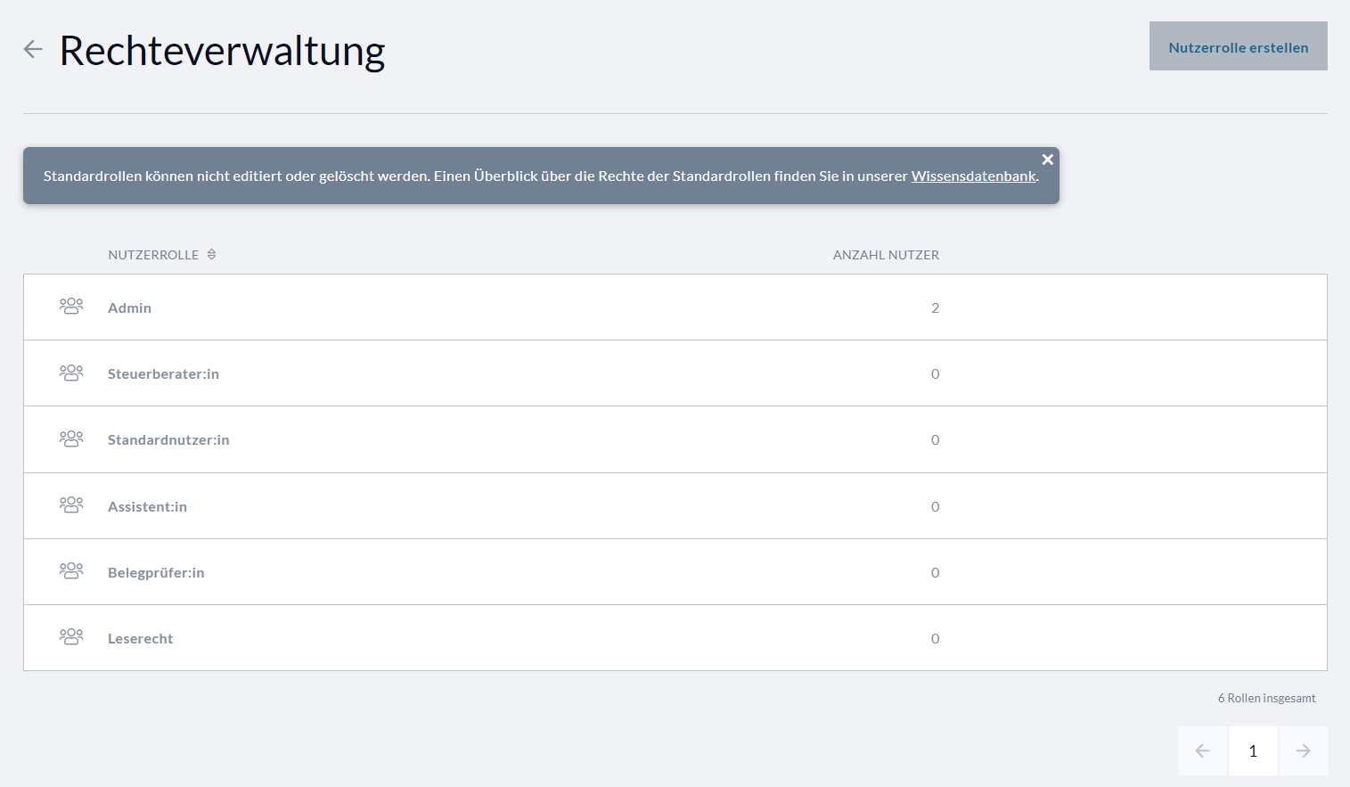 Hinweis: Benutzerrollen, die bereits vor einer Systemumstellung zugewiesen wurden, bleiben weiterhin bestehen. Sie werden in der Rechteverwaltung als individuelle Rollen geführt, können jedoch keinem weiteren Nutzer neu zugewiesen werden.
