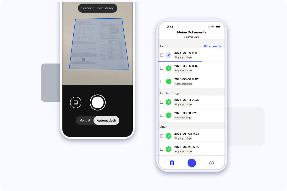 Die nuumera Scan-App ermöglicht die mobile Erfassung und Übertragung von Belegen, Rechnungen und Quittungen direkt von Ihrem Smartphone in Ihren nuumera-Account. Sie sorgt für eine sofortige, sichere und revisionskonforme Archivierung und erleichtert Ihnen die gesamte Vorerfassung.
